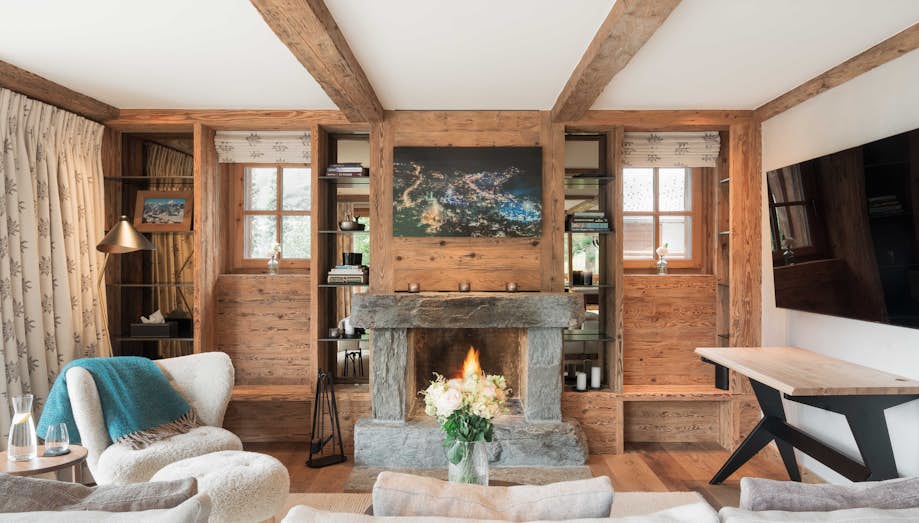 The open-plan living area sets the tone for your stay; filled with light, framed by floor-to-ceiling windows and a striking stone fireplace takes centre stage. The space flows effortlessly onto a south-facing balcony, where a private hot tub overlooks the alpine scenery.